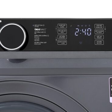 Đồng thời, nắp máy giặt được làm bằng kính chịu lực bền bỉ, sang trọng cùng với nút xoay được mạ gương sáng bóng lẫn phím cảm ứng siêu nhạy trên bảng điều khiển song ngữ Anh – Việt, giúp người dùng thao tác chức năng máy dễ dàng hơn.